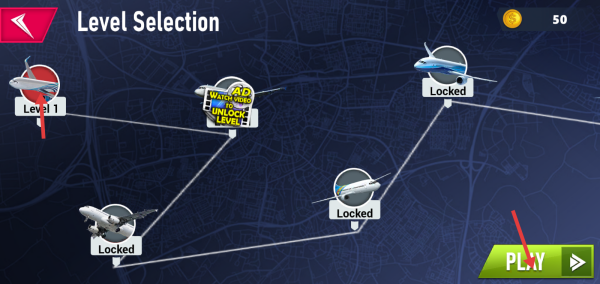 1、选择【Level1】,点击【PLAY】,开启第一关的飞行挑战,驾驶飞机,准备完成任务。