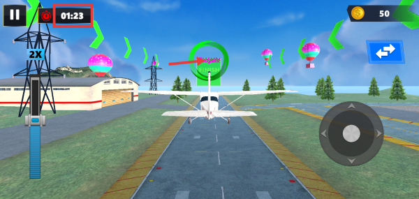 3、飞行时跟随绿色箭头指引,避开障碍物,保持稳定飞行,争取在规定时间内到达终点。