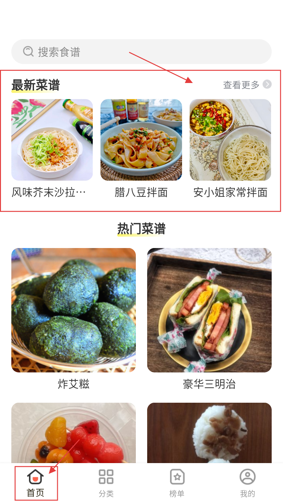 1、在【首页】找到【最新菜谱】,点击【查看更多】,可浏览更多新面类菜谱,开启美食探索。
