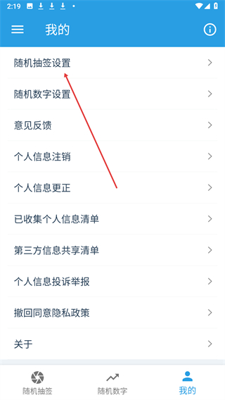 2、在个人界面找到随机抽签设置选项,点击后进入对应设置页面。