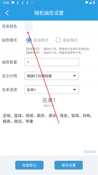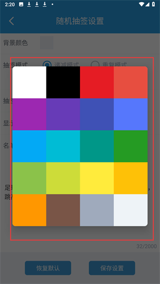 3、在随机抽签设置页点击背景颜色区域,弹出颜色选择面板供挑选。