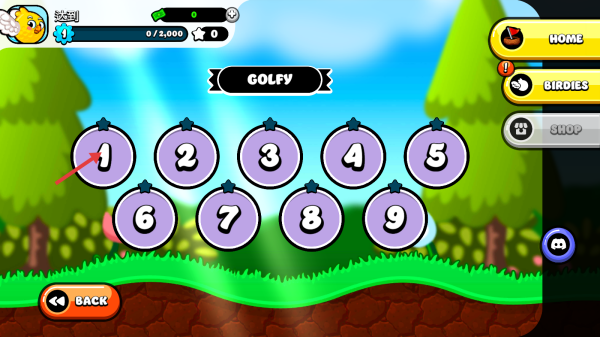 1、在关卡选择界面,点击数字【1】对应的圆形按钮,即可进入第一关,开启高尔夫挑战之旅。