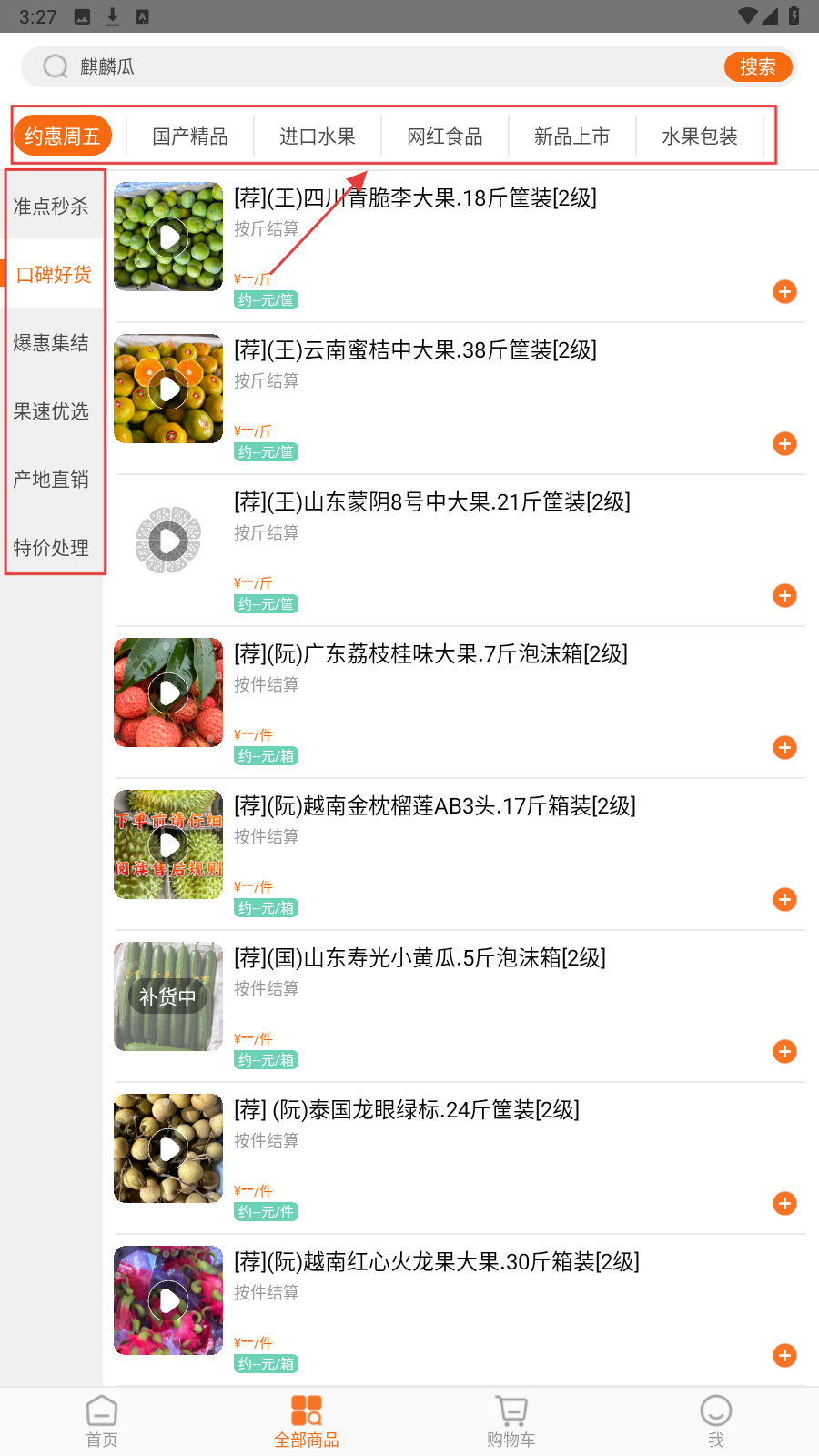 2、切到【全部商品】页,用顶部分类(约惠周五等)、左侧标签找水果。
