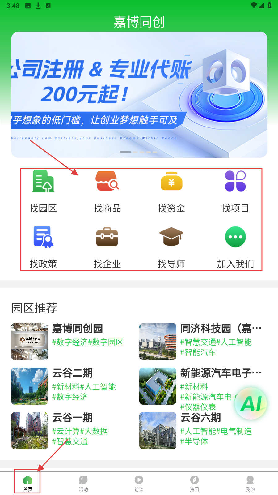 1、进入【嘉博同创】首页,点【找园区】等功能,按需选服务入口。