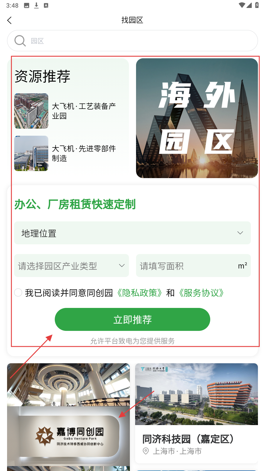 2、在【找园区】页,用资源推荐或筛选条件,填信息后点【立即推荐】。