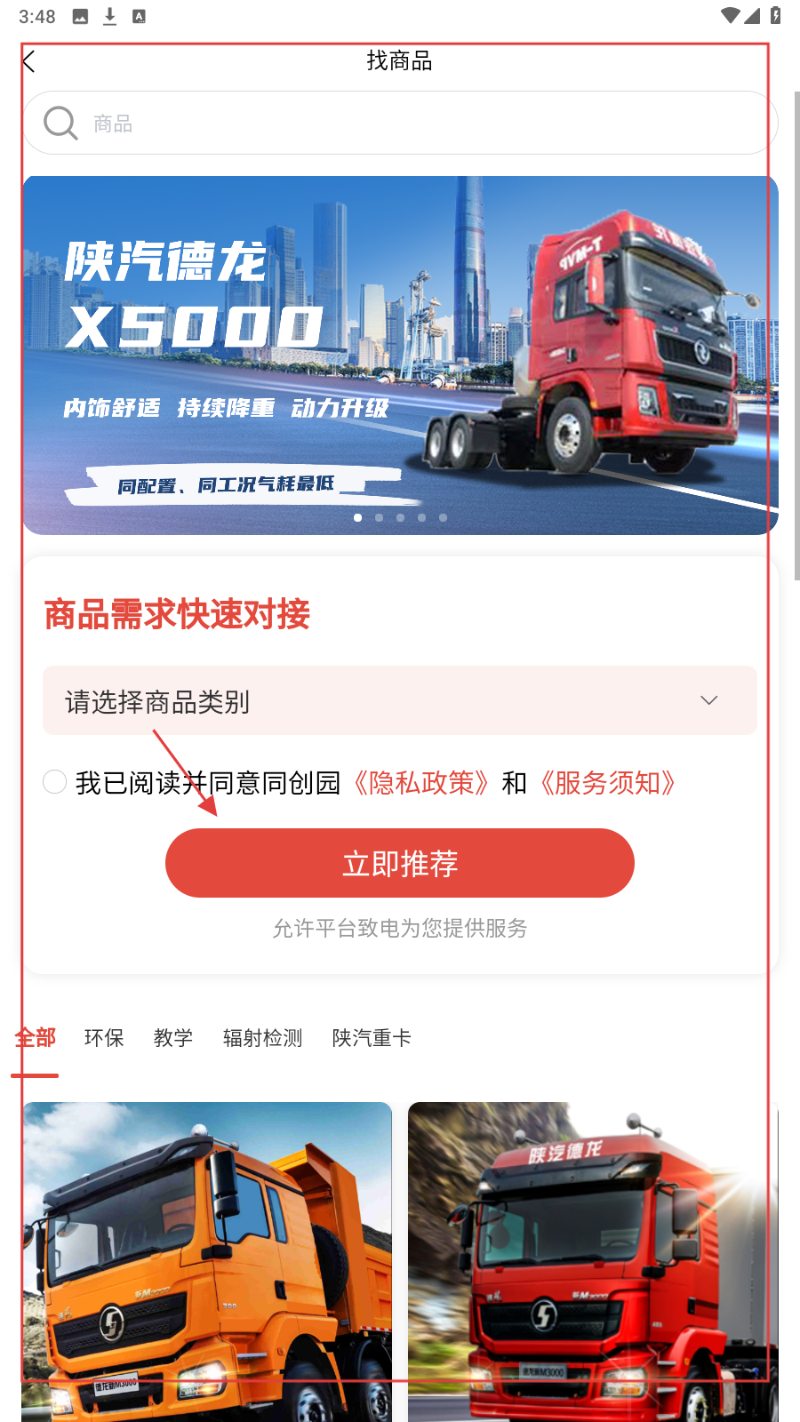 4、进入【找商品】页,选商品类别,同意协议后点【立即推荐】找商品。