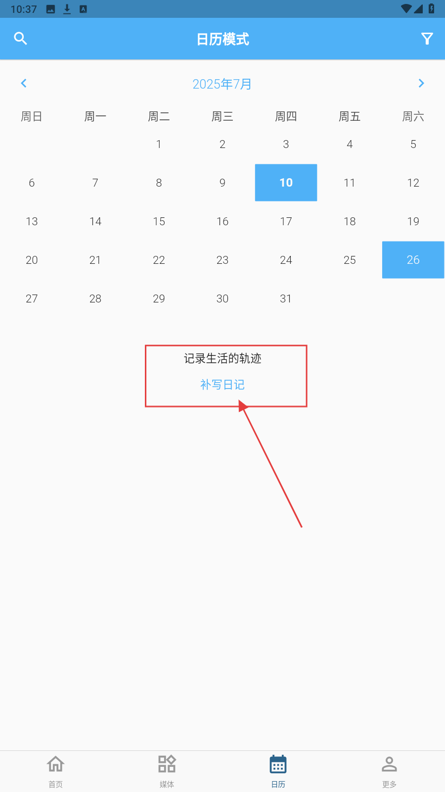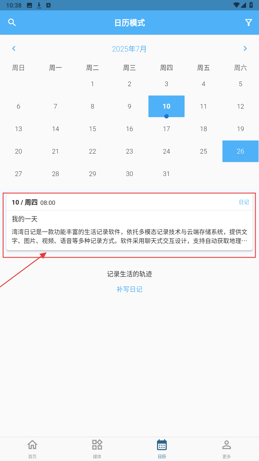 4、保存完成后,在【日历】页面对应日期下即可查看补写的日记。
