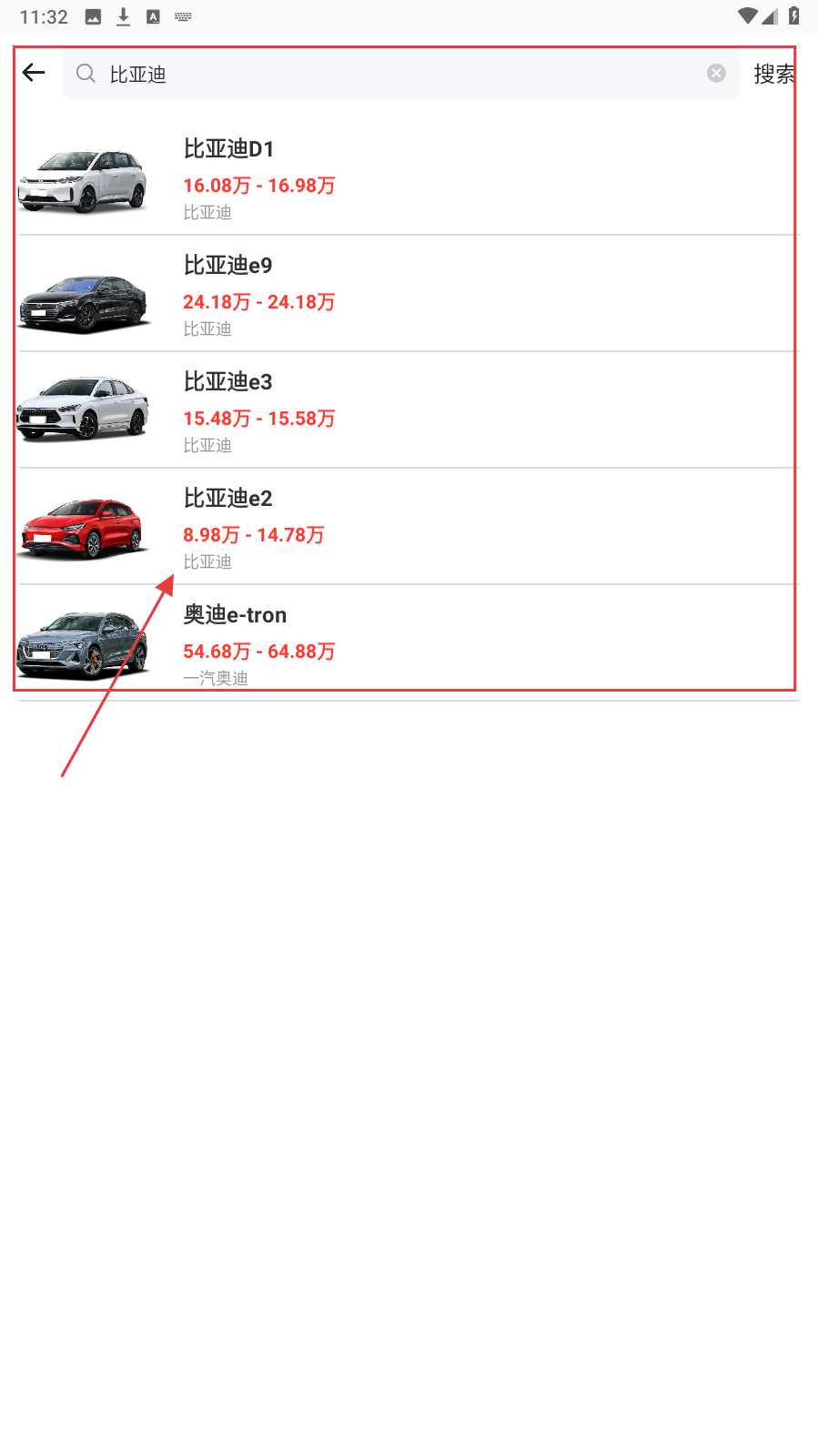 2、搜【比亚迪】后,从列表选对应车型,如【比亚迪e2】,查看详情。
