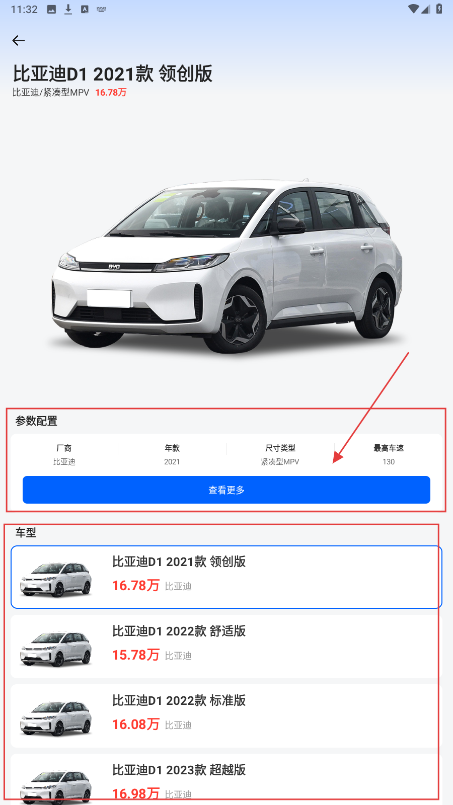 3、进入车型页,点【查看更多】,了解【比亚迪D1-2021款领创版】等参数配置。