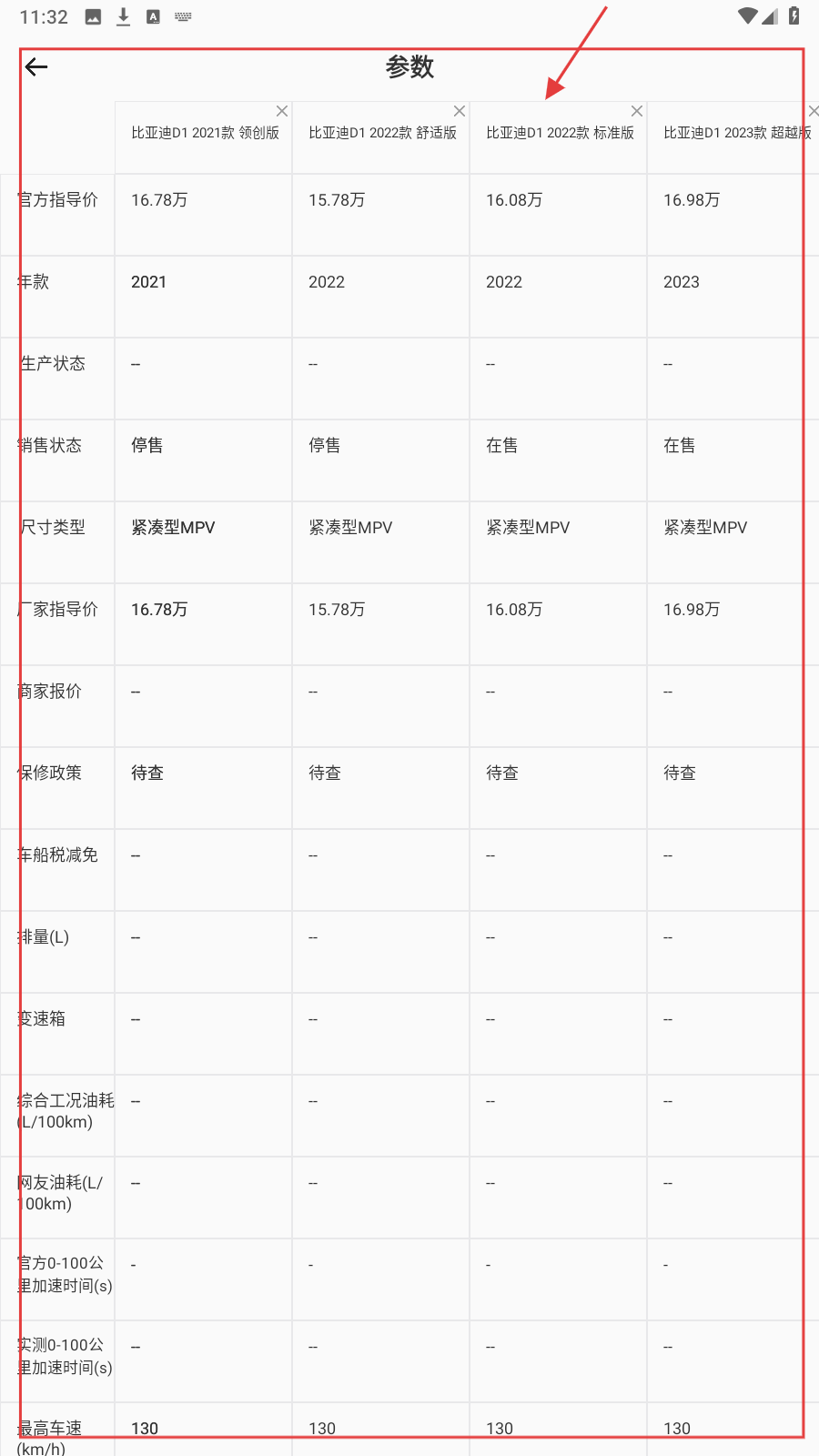 4、在参数页,对比不同年款比亚迪D1,依据【销售状态-在售/停售】选合适车型。