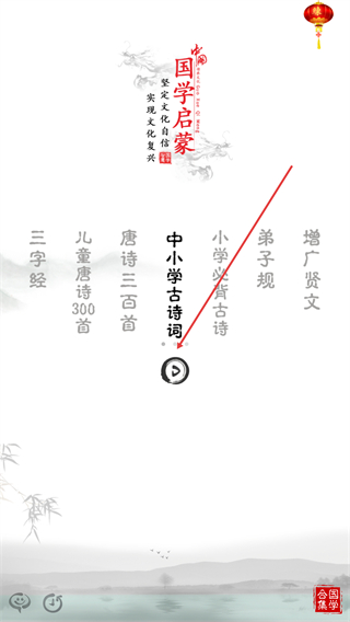 1、进入国学启蒙页,点击【中小学古诗词】播放按钮,开启诗词学习。