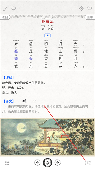 2、在《静夜思》详情页,点右下角书本图标,打开学习功能菜单。