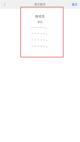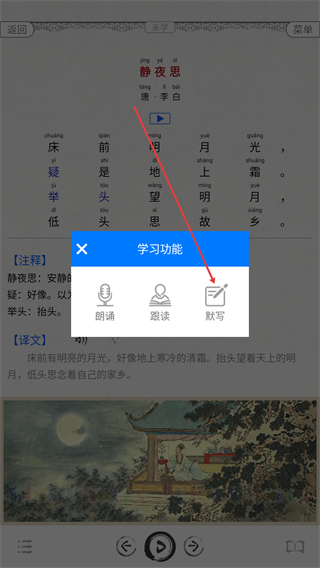 4、在学习功能菜单中选择默写选项,进入对应古诗词的默写页面。