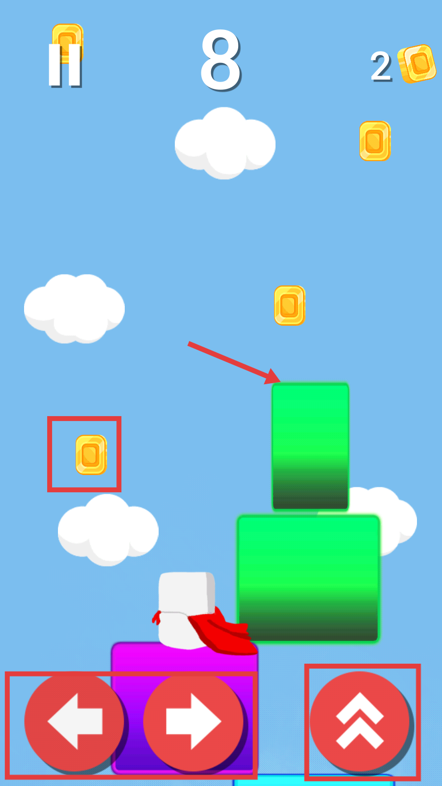 2、使用左右箭头移动,向上箭头跳跃,收集金币,避开障碍物。