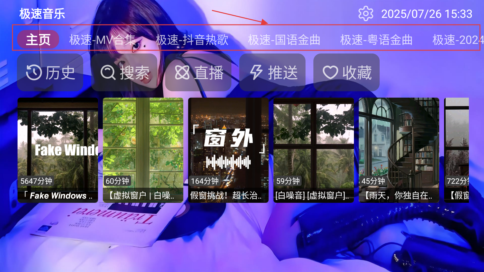 1、进入【极速音乐】,可先点【主页】等分类,快速找想听的音乐板块,选心仪分类探索。