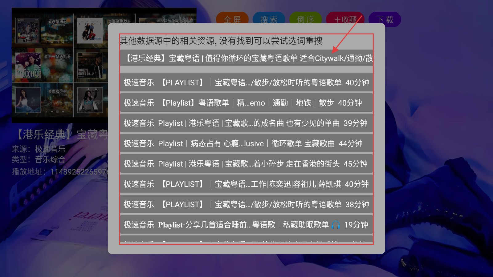 4、若搜索无结果,看【其他数据源】推荐,换词重搜或选相似歌单,拓展粤语音乐收听。