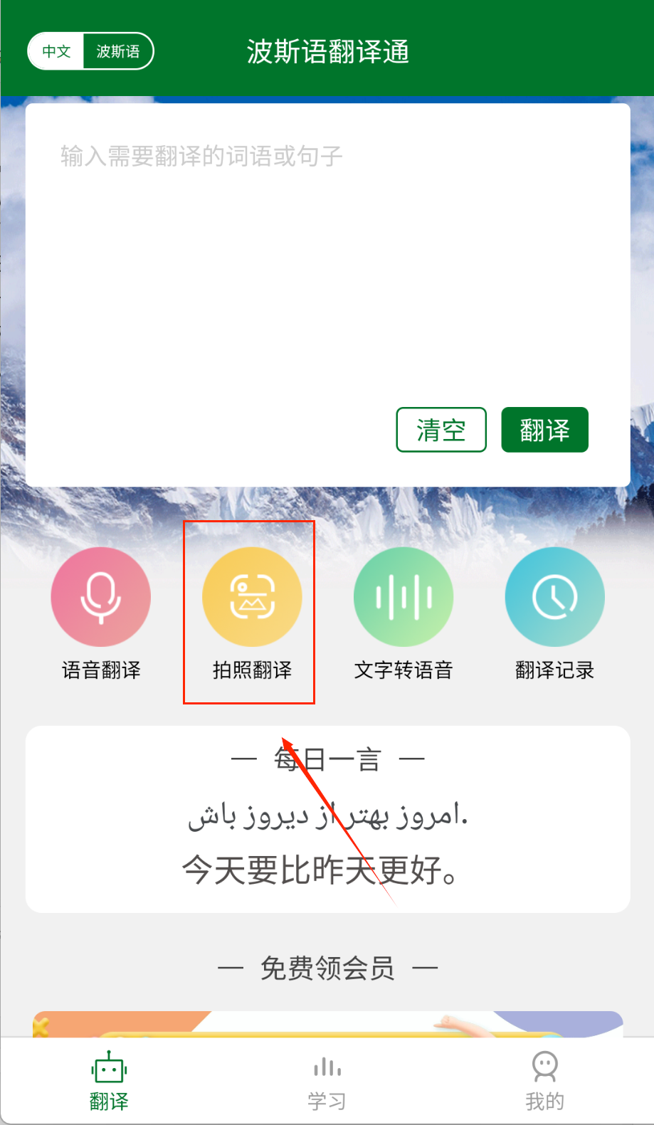 1、注册账号后选择翻译模式,输入或拍摄波斯语文档,系统自动识别并翻译成目标语言哦。
