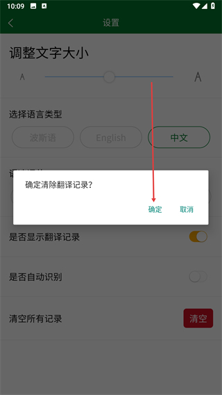 4、在弹出的确定清除翻译记录提示窗口里,点击确定按钮。