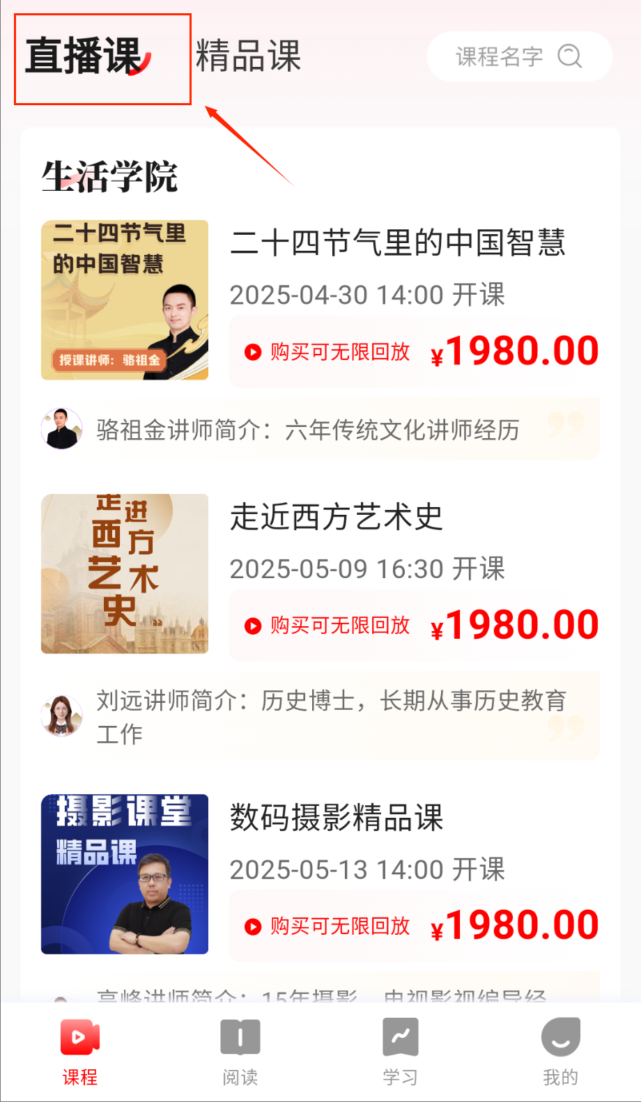2、直播分为经典解读、书法教学等8个主题专区,课程结束72小时内可无限次回放啦。