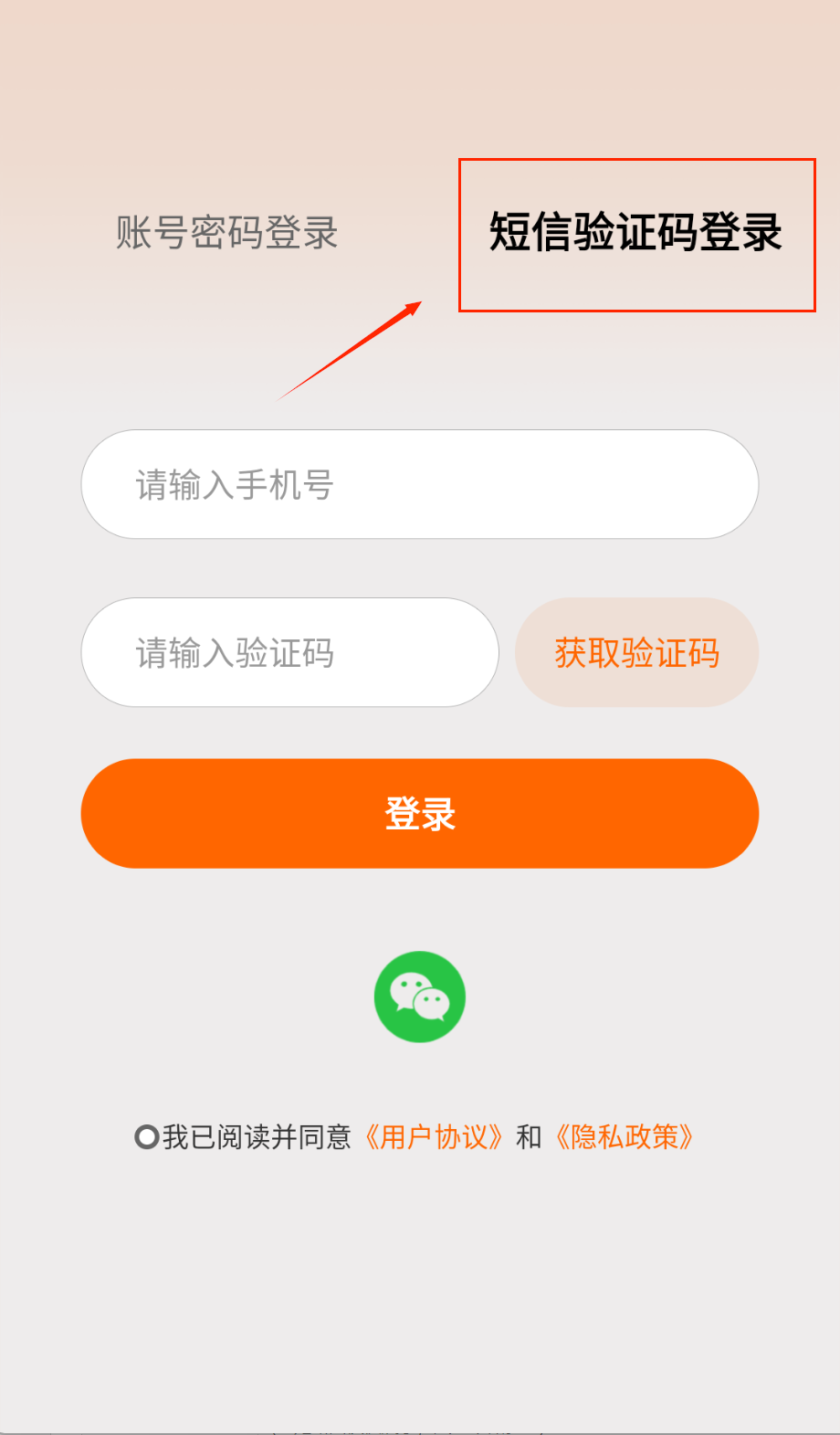 1、打开APP进入登录页,选择"短信验证码登录"方式,输入注册手机号获取验证码哦。
