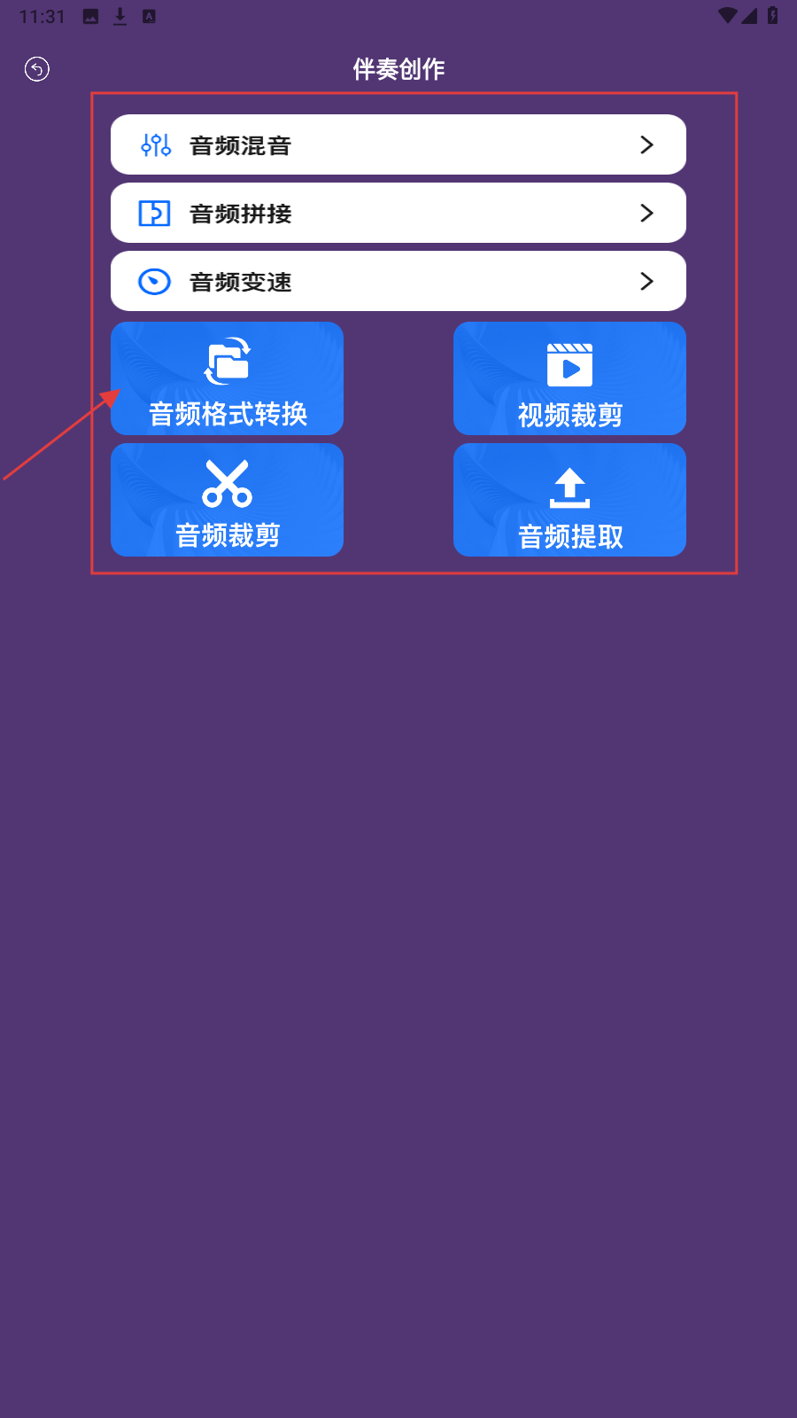 2、点【伴奏创作】,选音频混音/拼接等功能,开展音频制作操作。