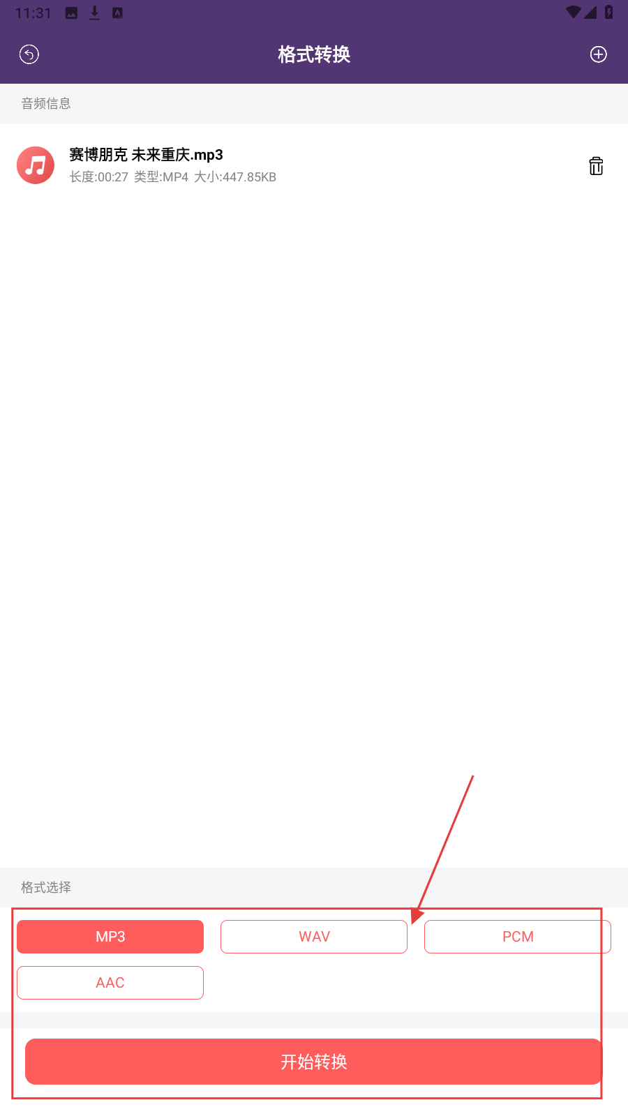 3、在【格式转换】页,选音频文件,择目标格式(MP3/WAV等),点【开始转换】。