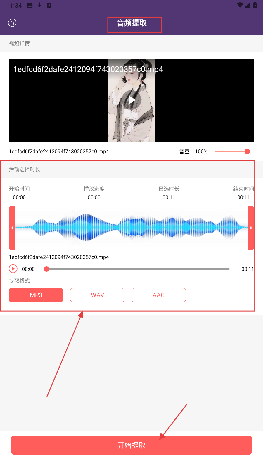 4、还可以用【音频提取】,选视频,定提取时段、格式,点【开始提取】获取音频。
