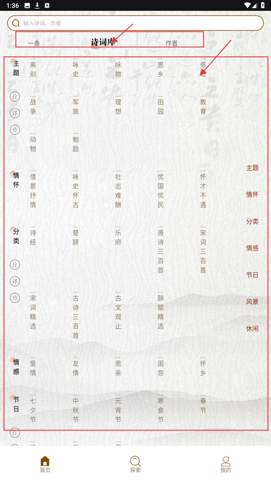 1、进入诗词库,按需选【主题】【情怀】等分类,精准找诗词。