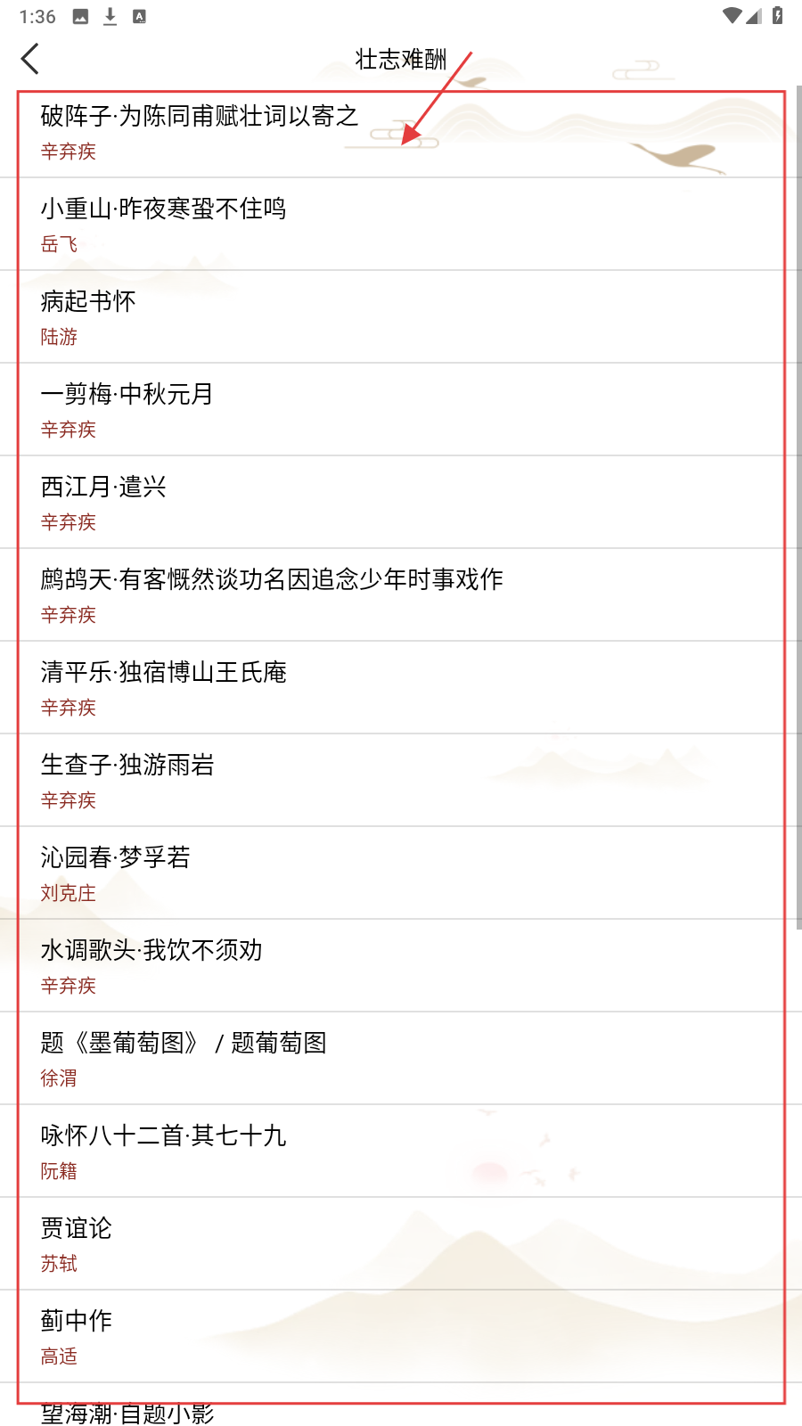 2、在分类结果里,点选想了解的诗词,如【破阵子·为陈同甫赋壮词以寄之】。