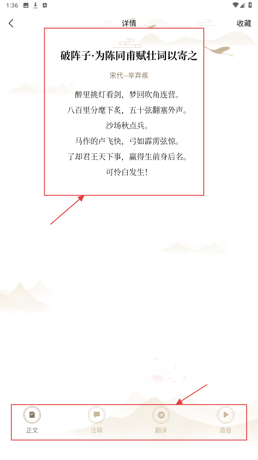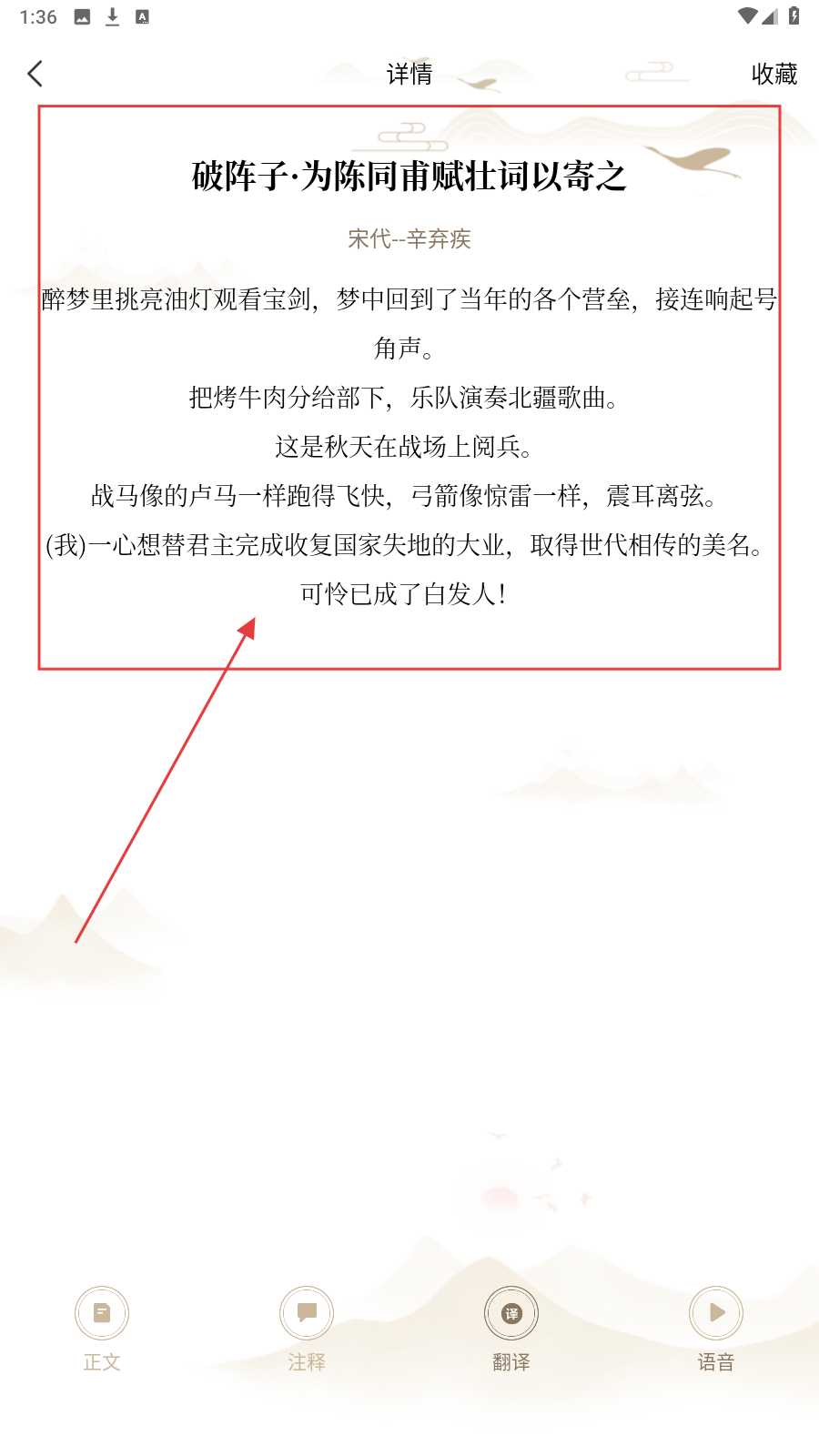 3、进入诗词详情,查看【破阵子·为陈同甫赋壮词以寄之】原文内容。