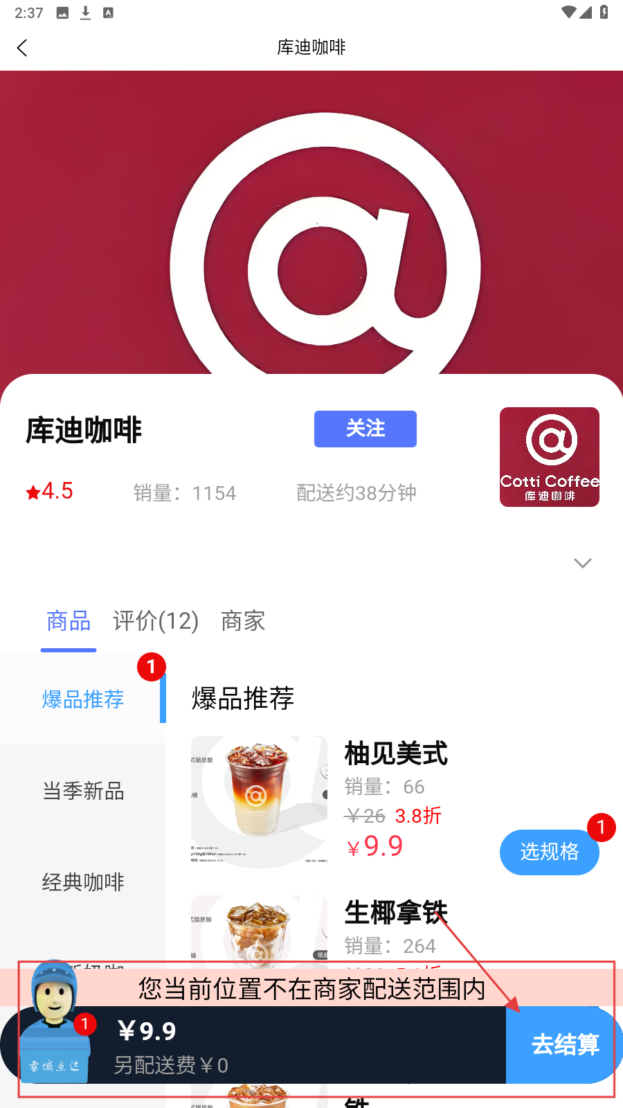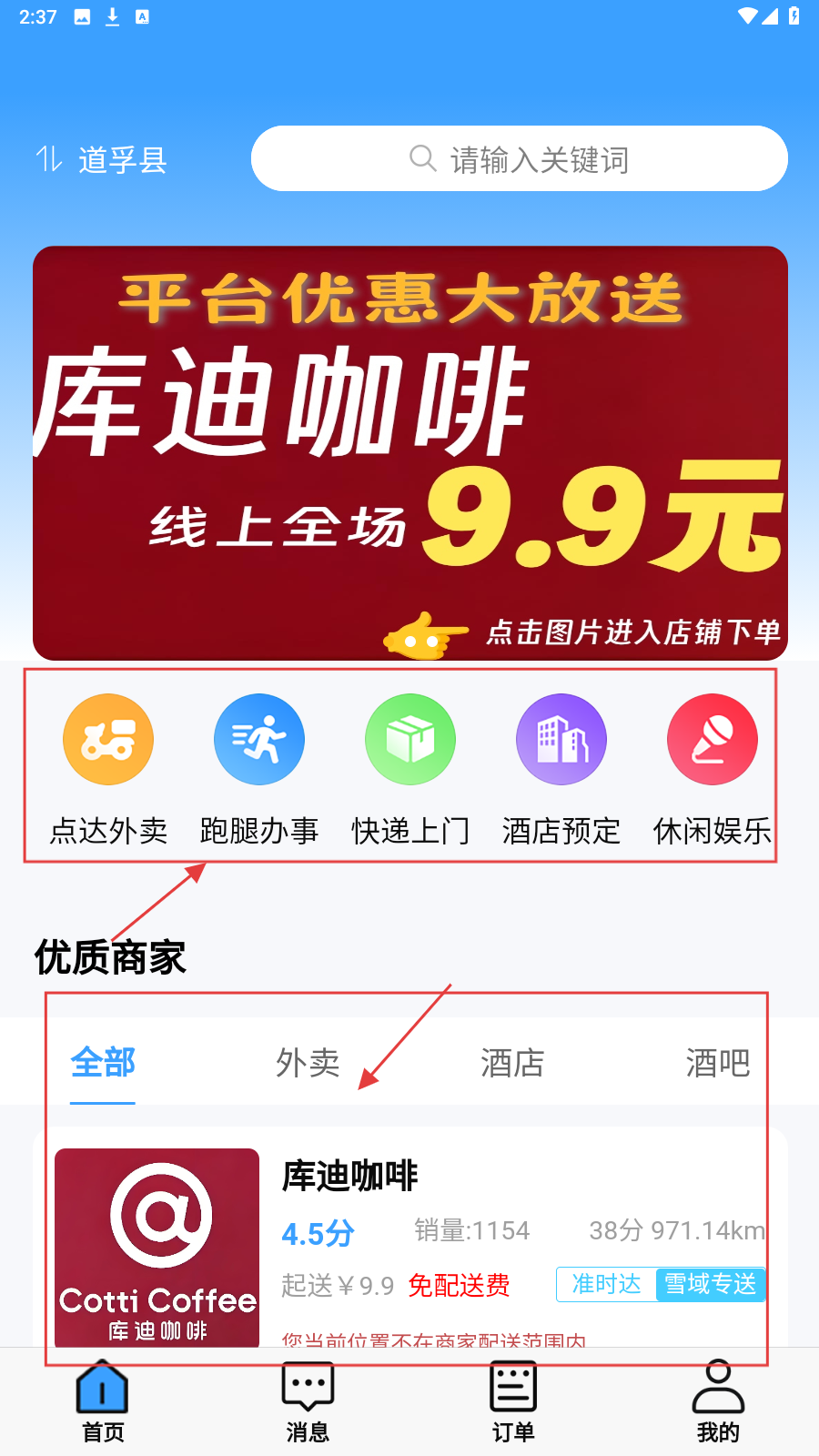 1、在首页查看【优质商家】,选择心仪的商家点击,如库迪咖啡。