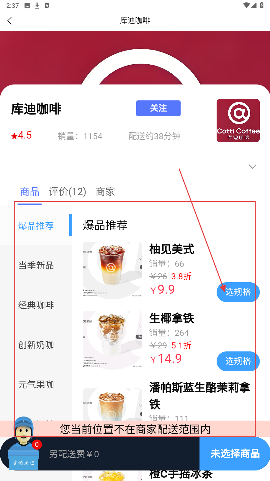 2、在库迪咖啡选爆品如柚见美式,点击【选规格】下单。