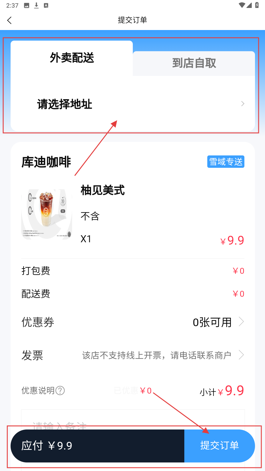 4、选【外卖配送】填地址,核对金额后点【提交订单】完成下单。