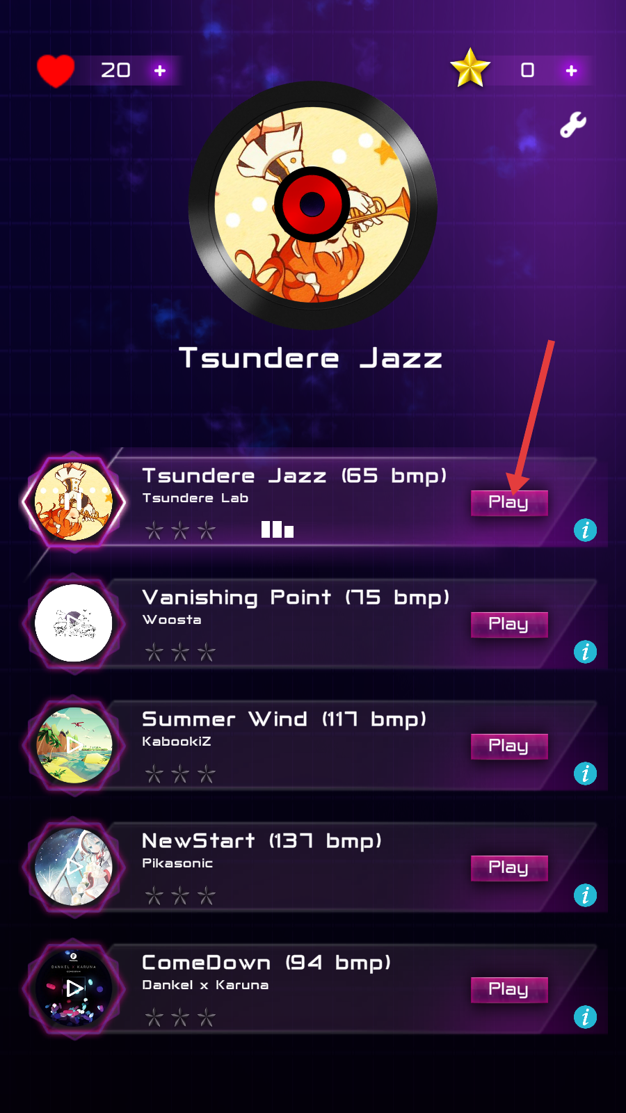 1、在歌曲选择界面,选择喜欢的音乐,点击“Play”开始游戏。