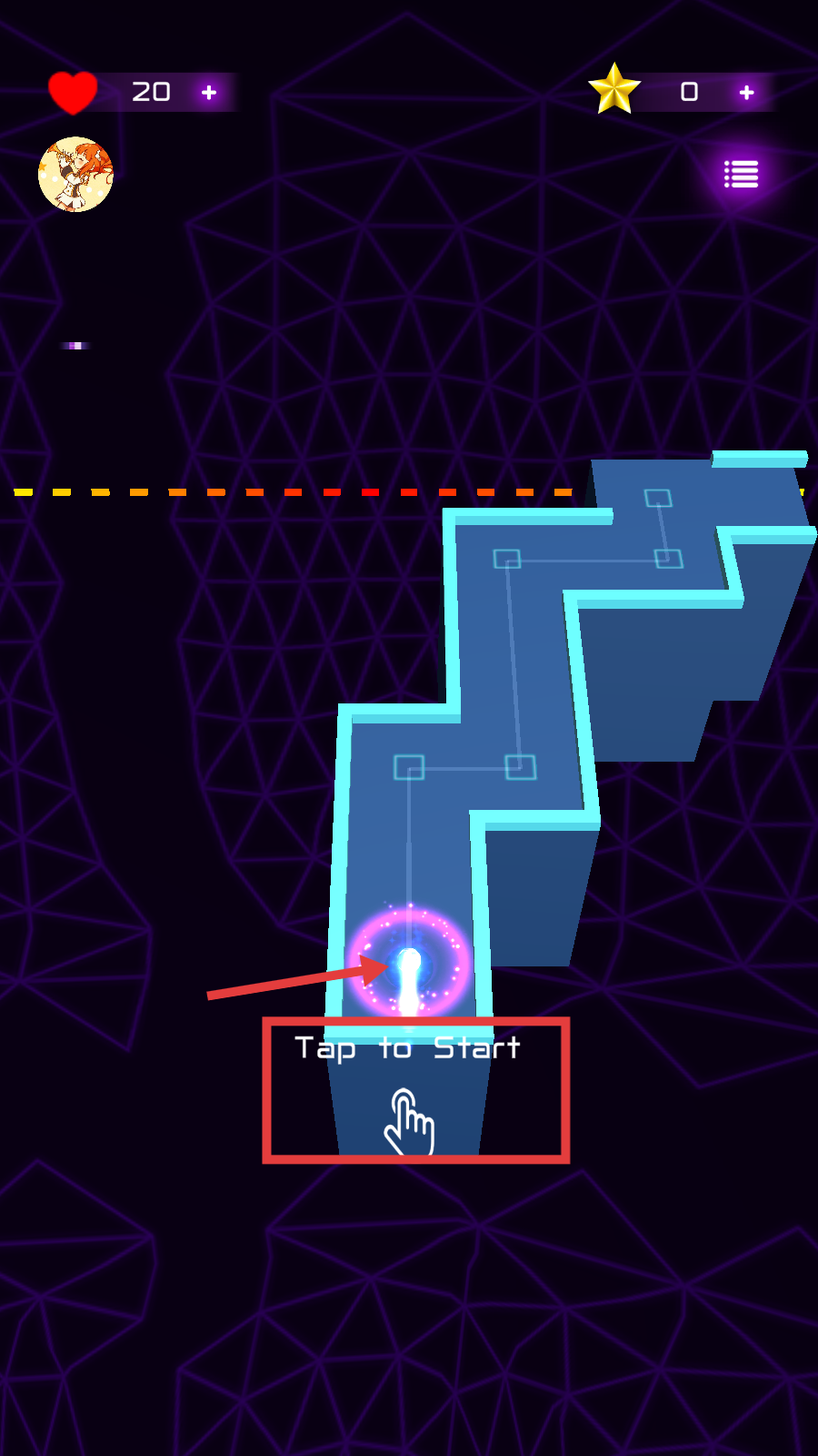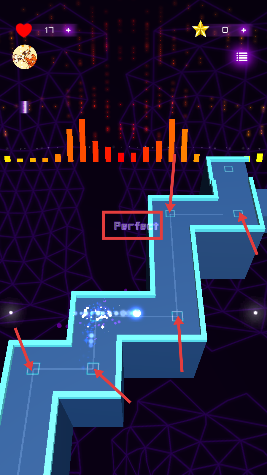2、根据音乐节奏点击屏幕上的光点,光点会拐弯,小心不要碰撞到道路两边。