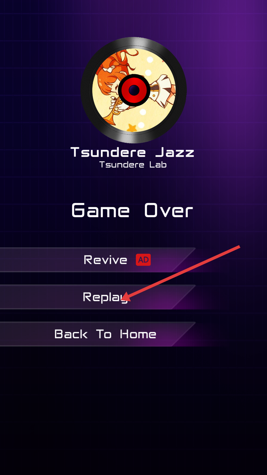 4、若游戏失败,可选择“Replay”重新挑战当前歌曲,或点击“BackToHome”返回主界面选择其他歌曲。
