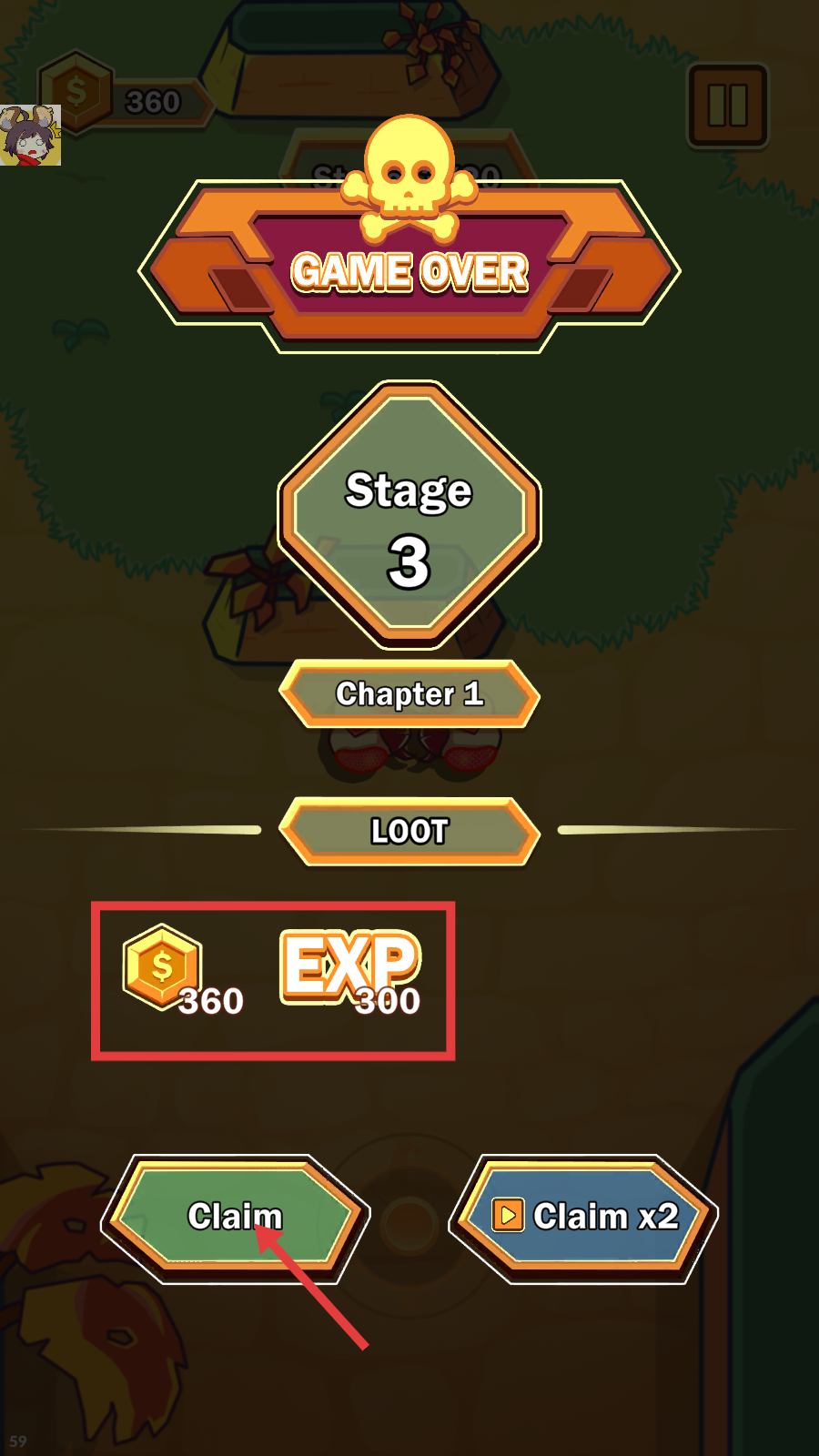 4、若游戏失败,可点击【Claim】按钮领取金币和经验值奖励,为下一次挑战积累资源。