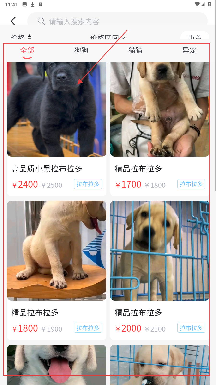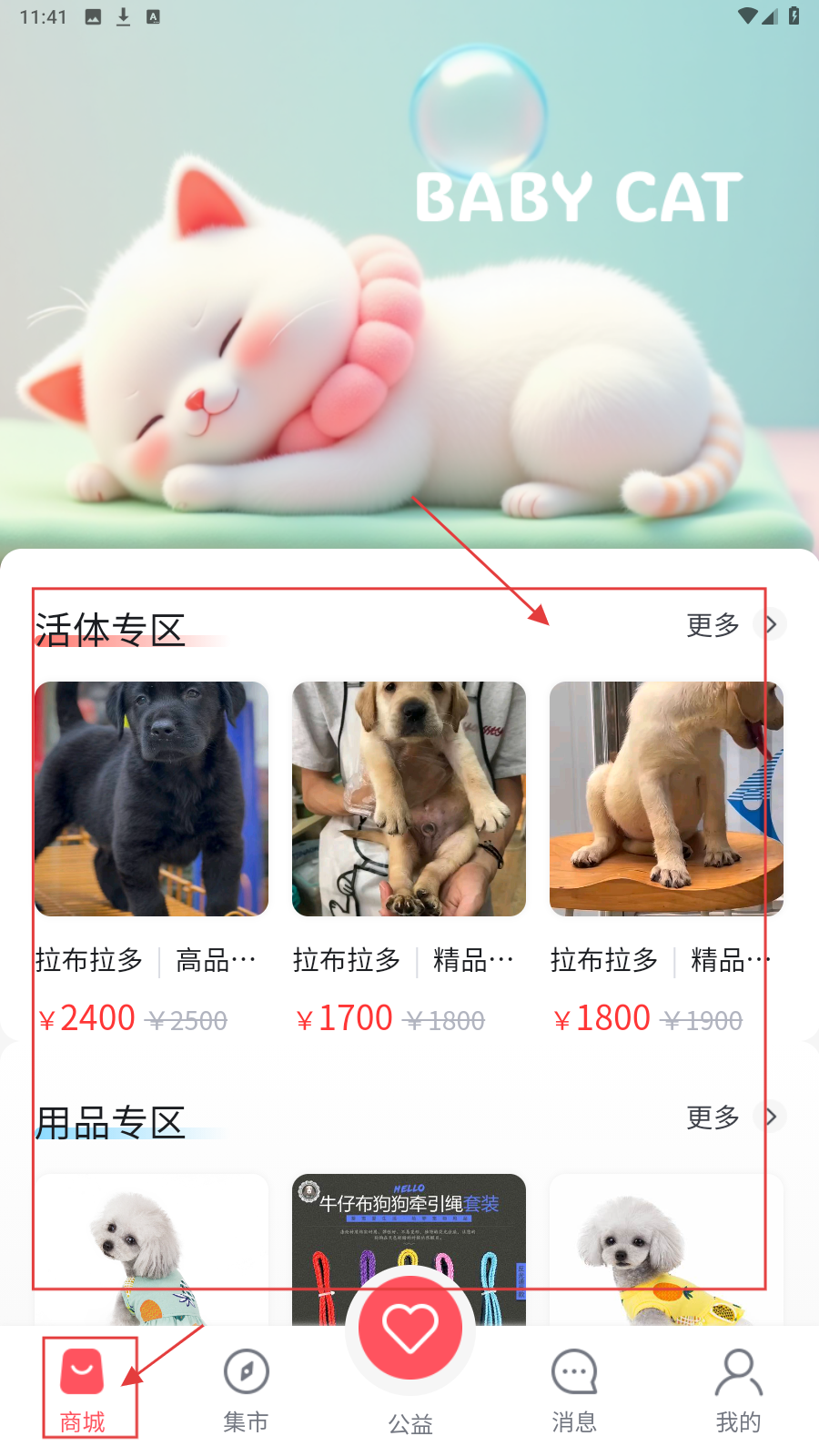 1、进入APP【商城】,选【活体专区】,浏览拉布拉多幼犬等宠物。