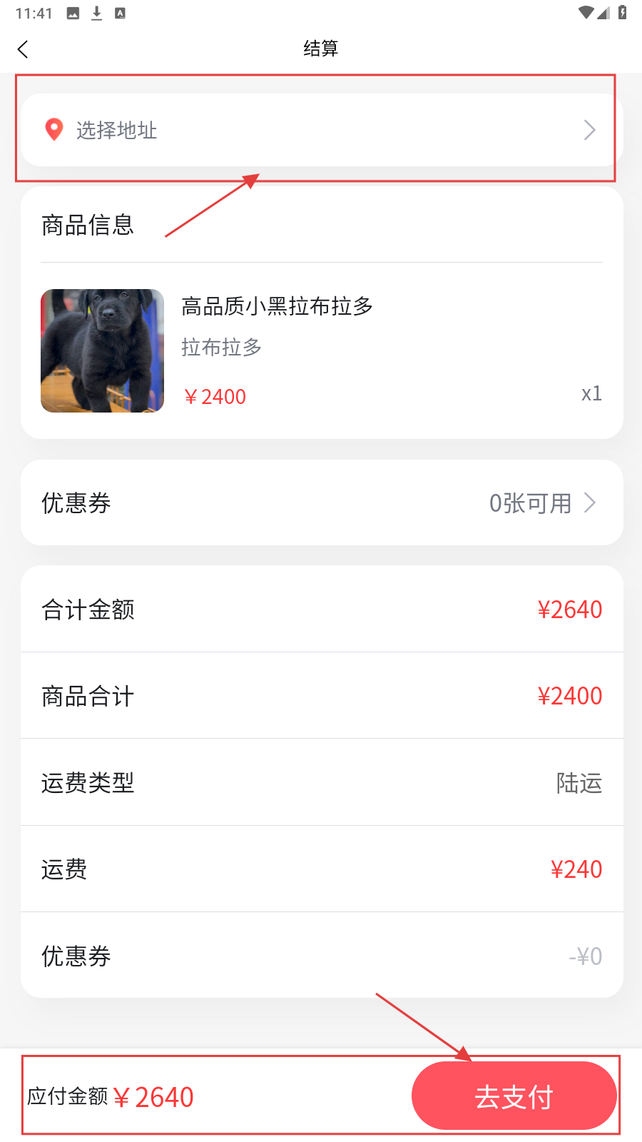 4、结算页选收货地址,核对金额,点【去支付】完成购买。