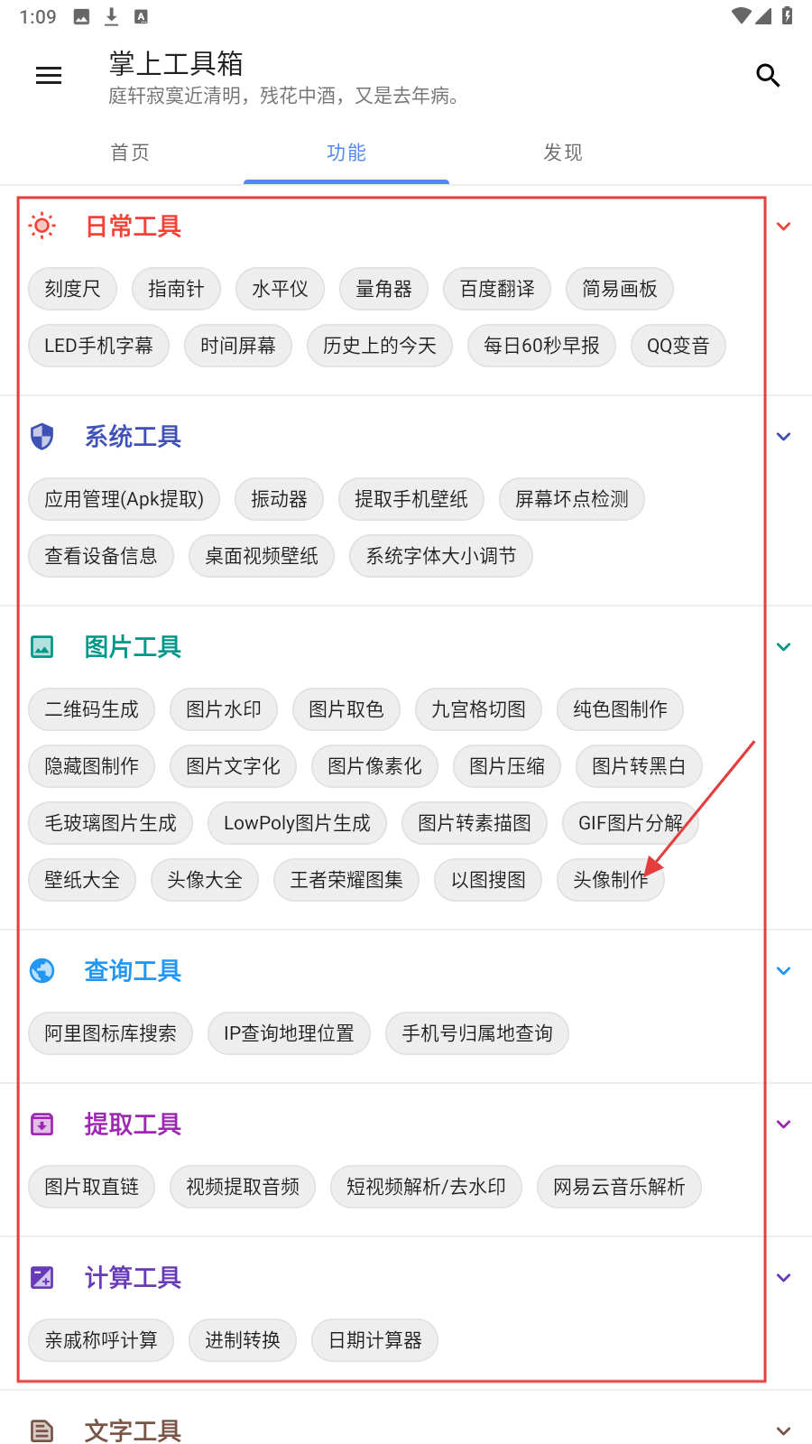 1、打开APP进【功能】页,在【图片工具】找【头像制作】入口进入。