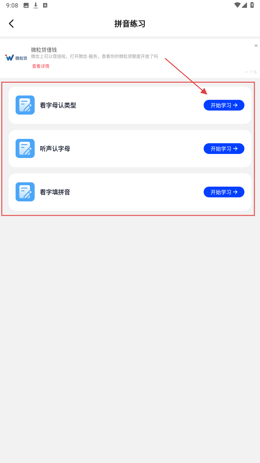 2、进入【拼音练习】页面,选择要学习的类型,点击【开始学习】。