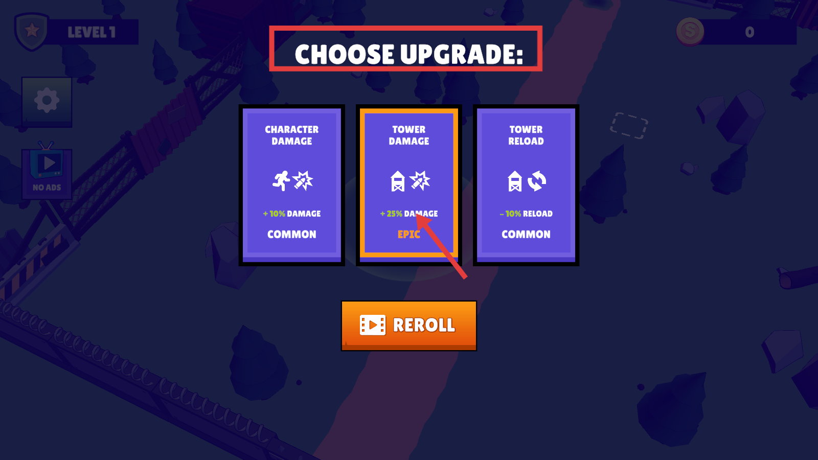 1、升级选择优先【TOWER-DAMAGE】的【EPIC】品质,+25%伤害提升显著,助力后续防御更高效。