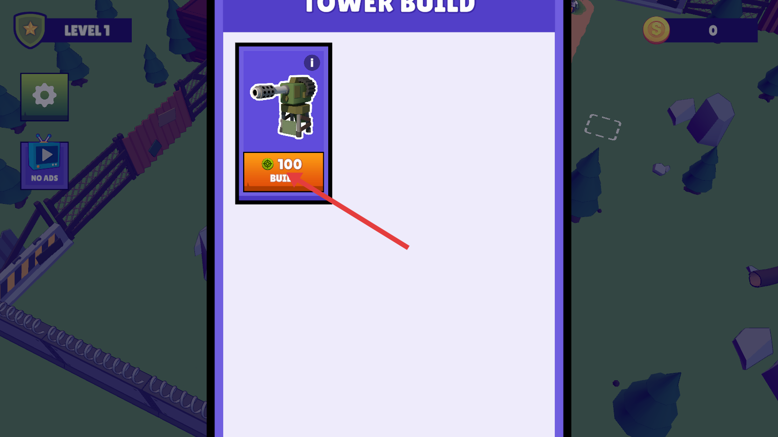 2、积累资源后点击【TOWER-BUILD】界面的【BUILD】按钮,花费100资源建造炮塔,强化防御能力。