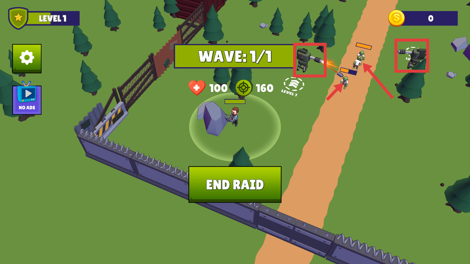3、战斗时利用炮塔攻击敌人,关注【WAVE-1/1】波次进度,敌人消灭后可点击【END-RAID】结束关卡。