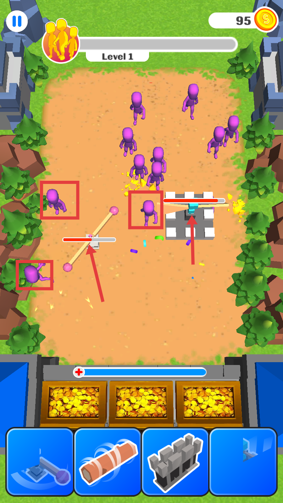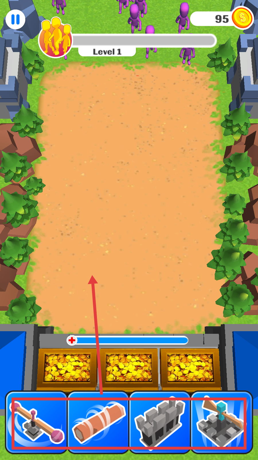 2、利用【95】金币在底部选择合适道具布置,构建防御阵线来阻挡紫色敌人的进攻。