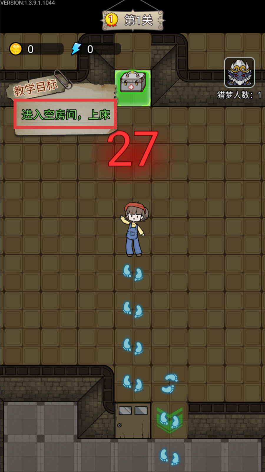 1、第1关按【教学目标-进入空房间,上床】指引行动,沿脚印路径移动至房间,完成初始阶段任务推进流程。