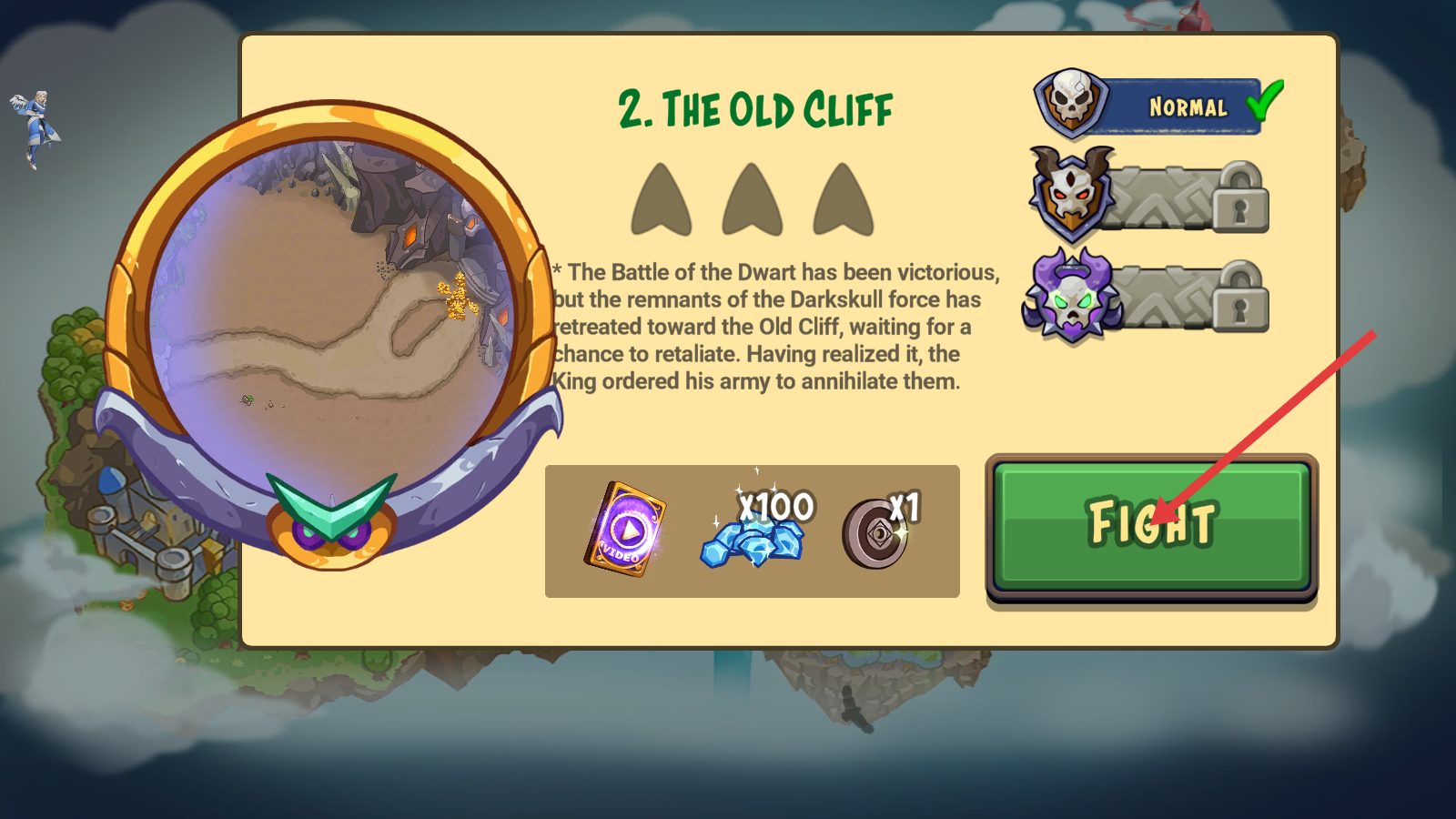 1、点击【FIGHT】进入【2.-THE-OLD-CLIFF】关卡,战前留意奖励为【x100】蓝晶与卷轴,提前做好战斗筹备。