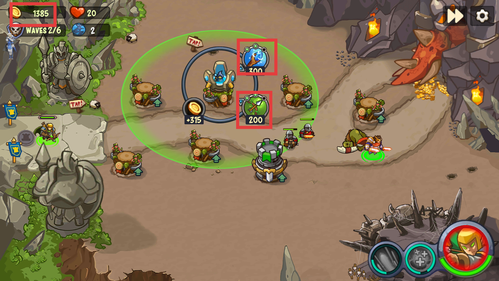 3、积累【1385】金币后,优先升级【300】蓝晶技能与【200】绿色技能,强化防御与输出提升战斗效率。