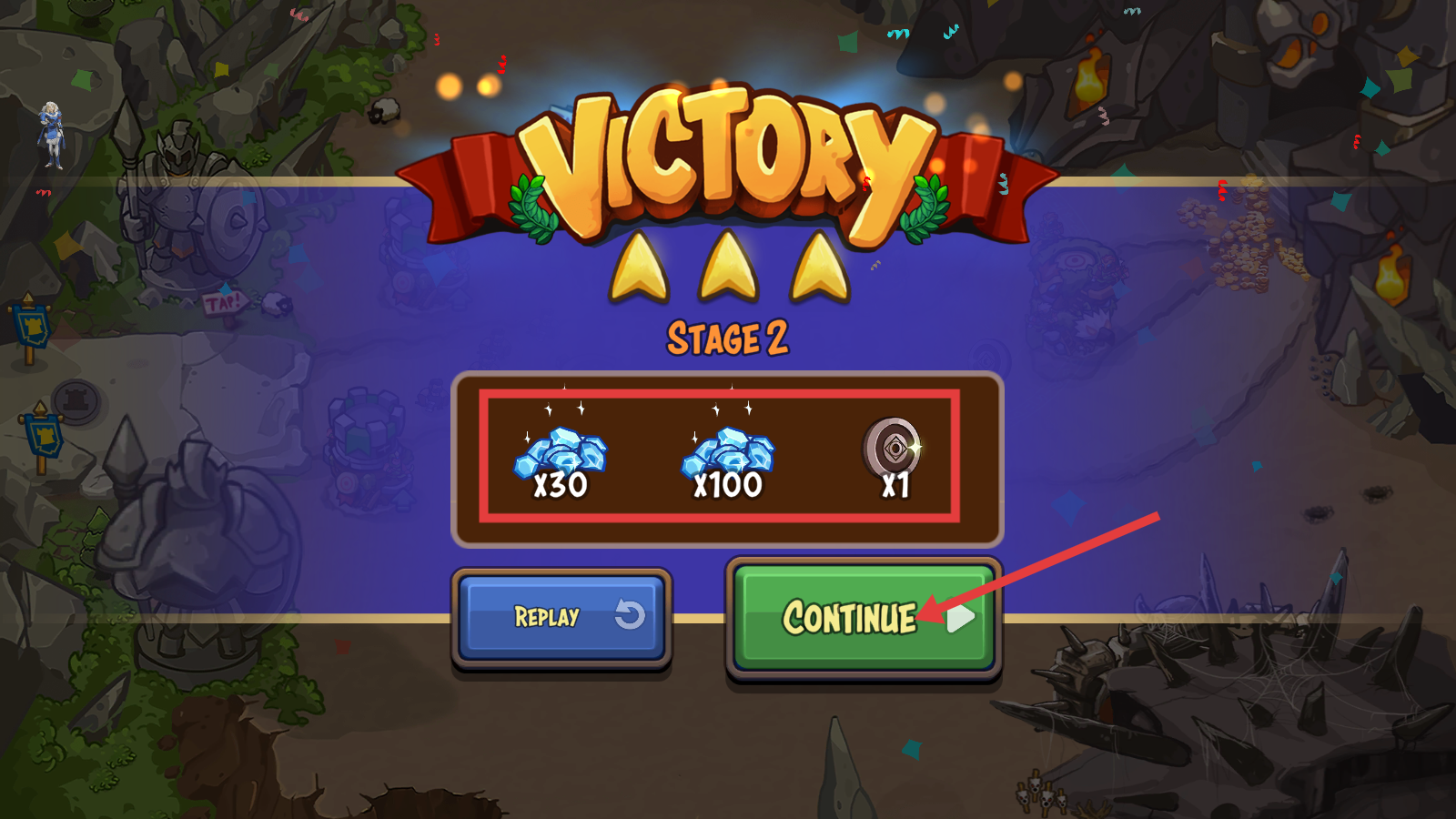 4、通关后获取【x30】【x100】蓝晶及卷轴奖励,点击【CONTINUE】推进至下一关,积累资源为后续挑战做准备。