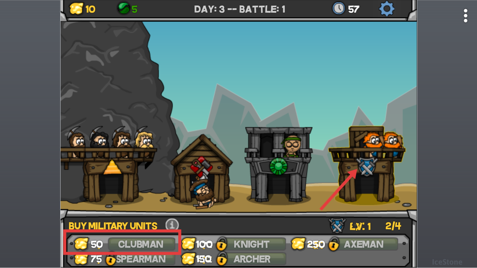 2、第三天花费【50】金币招募【CLUBMAN】,填充军事建筑,提升战力应对即将到来的战斗。